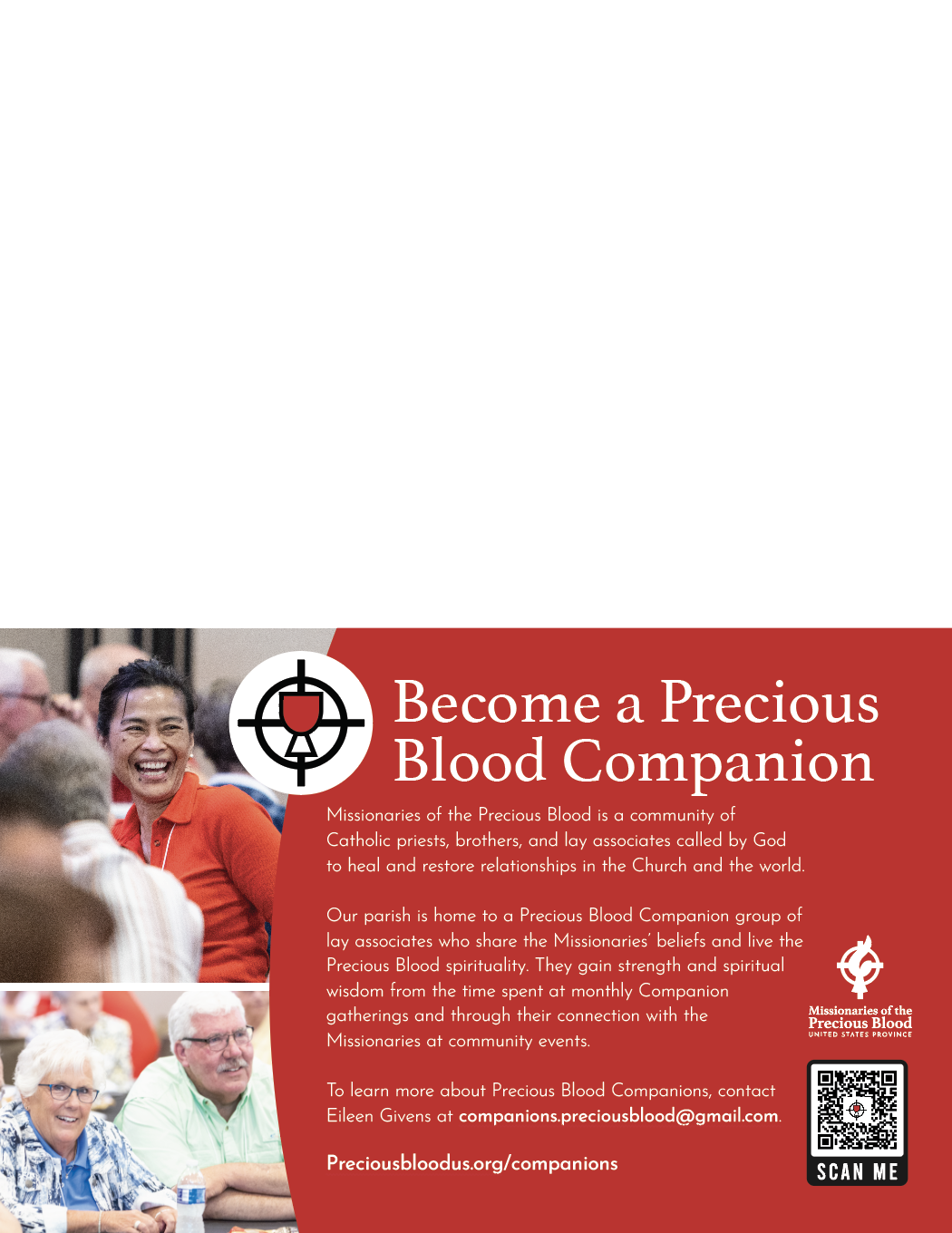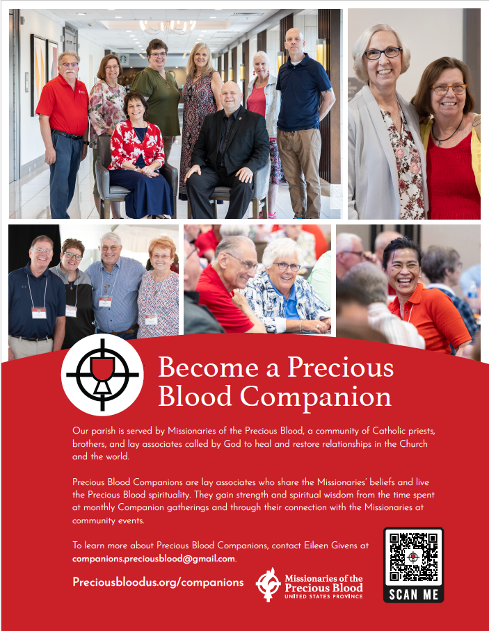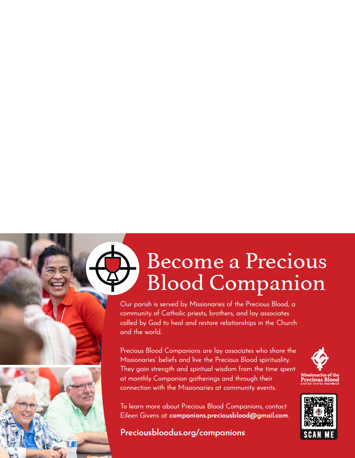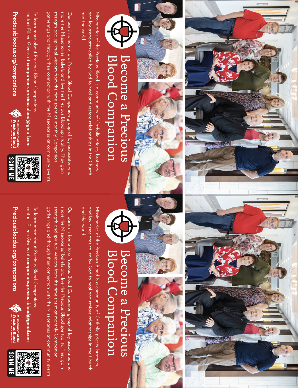 Bulletin inserts in 8.5x11 paper size for easy printing or placing digitally. The bulletins in this section are created for parishes with a Missionaries of the Precious Blood Companion group but are not led by a C.PP.S. priest.